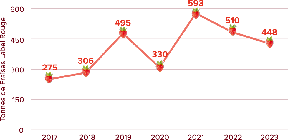 En 2023 les adhérents ont produit environ 20 000 tonnes de fraises dont 448 tonnes en Label Rouge.