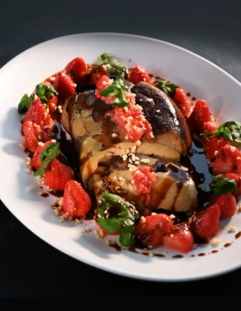 Couper les fraises en deux dans la longueur ; en garder 1/3 que l’on va tailler en brunoise. Faire sauter le reste dans une poêle avec une noisette de beurre et les ajouter dans la sauteuse à quelques minutes de la fin de cuisson du foie. Les égoutter en les laissant le plus possible entières. Réserver à part. Oter le foie gras de la sauteuse et le réserver dans un plat fermé avec du papier film. Garder ce plat au four à 60°.