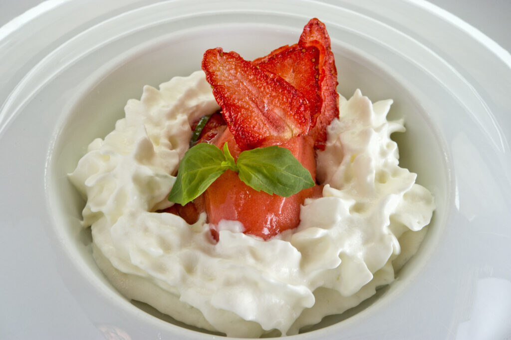 À l’aide du siphon, dresser au centre l’émulsion au coco.