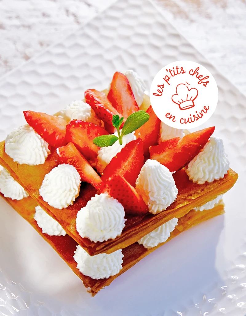 Couvrir d’un troisième carré et décorer le dessus du millefeuille de mascarpone, de fraises et de quelques feuilles de menthe.