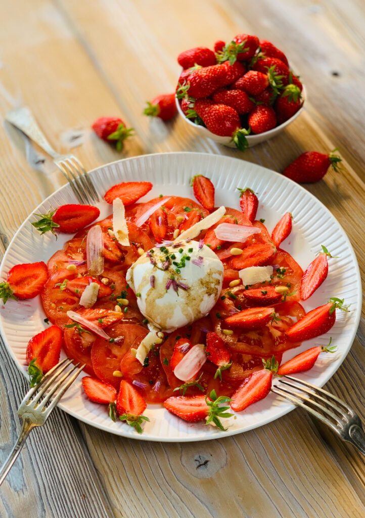 Dresser une rosace de tomate et ajouter harmonieusement les fraises, les tomates cerise, les tranches de radis, les copeaux de parmesan et les pignons de pin.