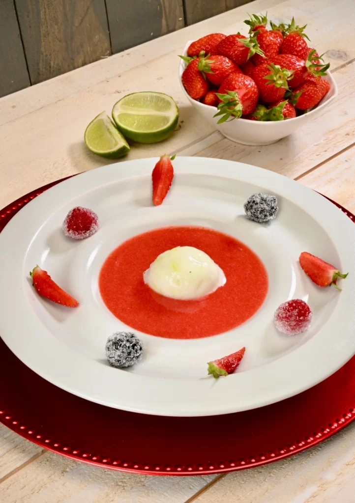 Dans une assiette creuse, versez un fond de soupe de fraises au basilic. Ajoutez quelques fruits rouges ainsi que des fruits cristallisés. Placez au centre une boule de glace vanille.